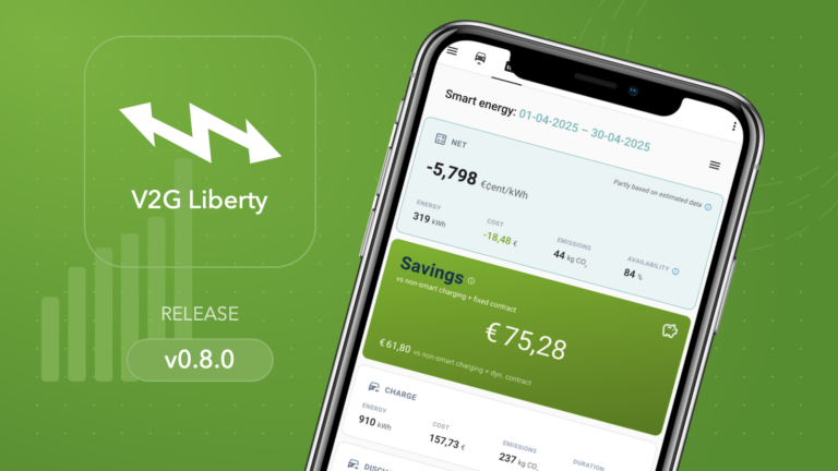 V2G Liberty is een app voor bidirectioneel laden. Met een bidirectionele lader wordt je elektrische auto een slimme batterij-op-wielen. V2G Liberty optimaliseert en automatiseert het laadproces: laden wanneer stroom goedkoop en groen is.